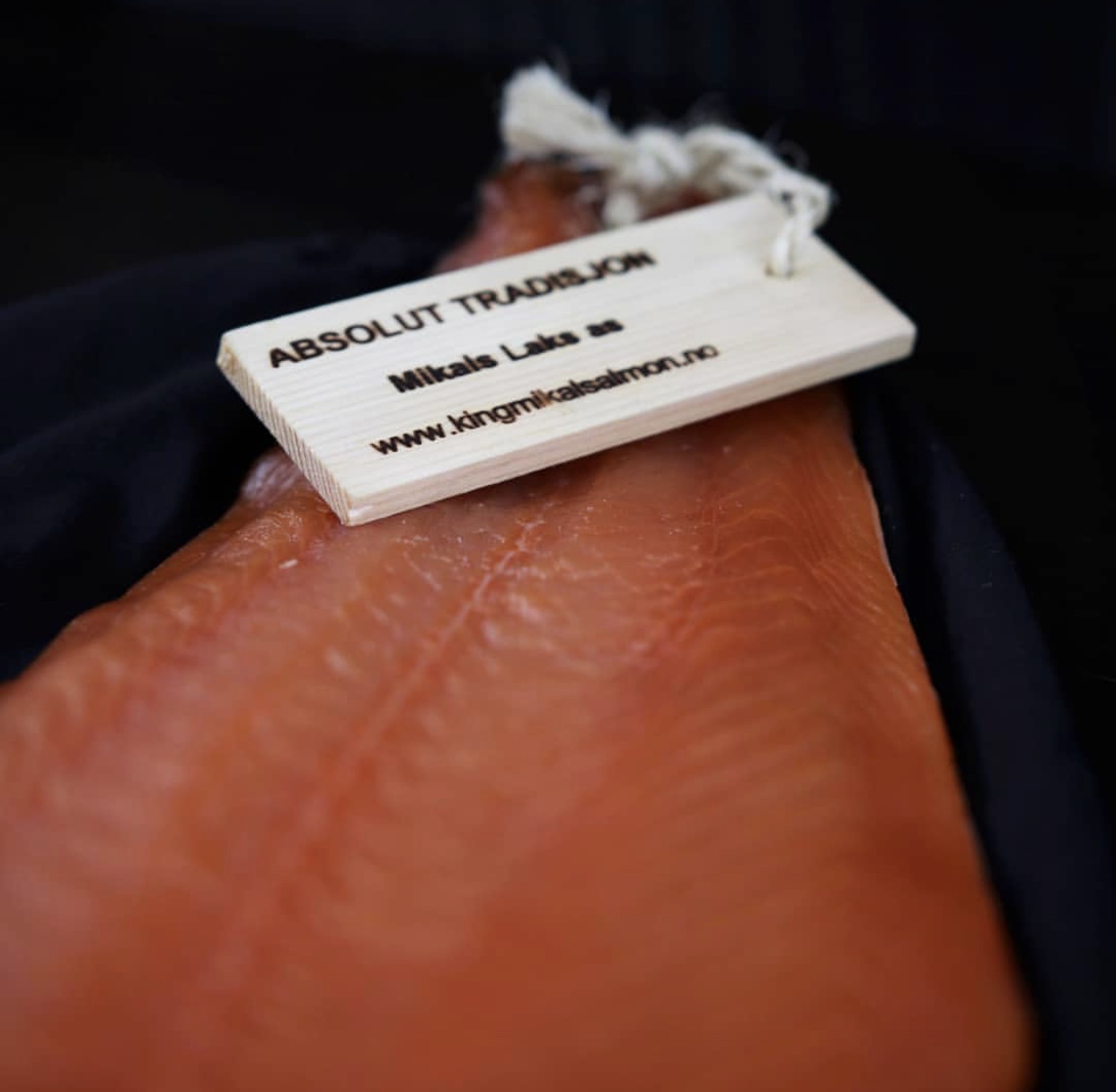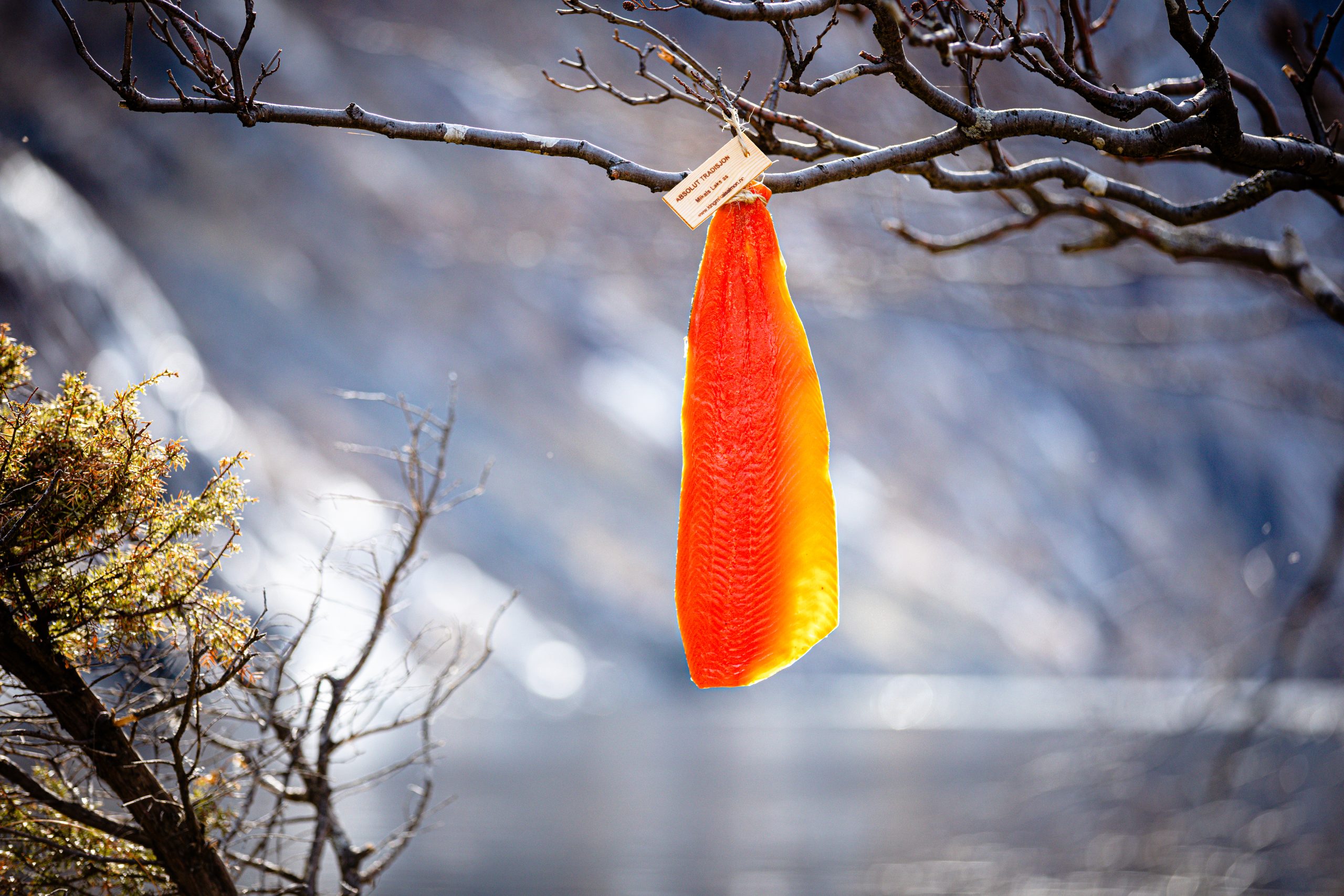 Eines unserer Hauptprodukte. Hochwertiges Lachsfilet, das in einer eigenen Produktionsstätte in der Nähe des Fjords trocken gesalzen, getrocknet und geräuchert wird. Der Prozess beginnt am selben Tag, an dem der Lachs aus den Netzgehegen geholt wird, und es dauert etwa eine Woche, bis er zum Verpacken bereit ist.
