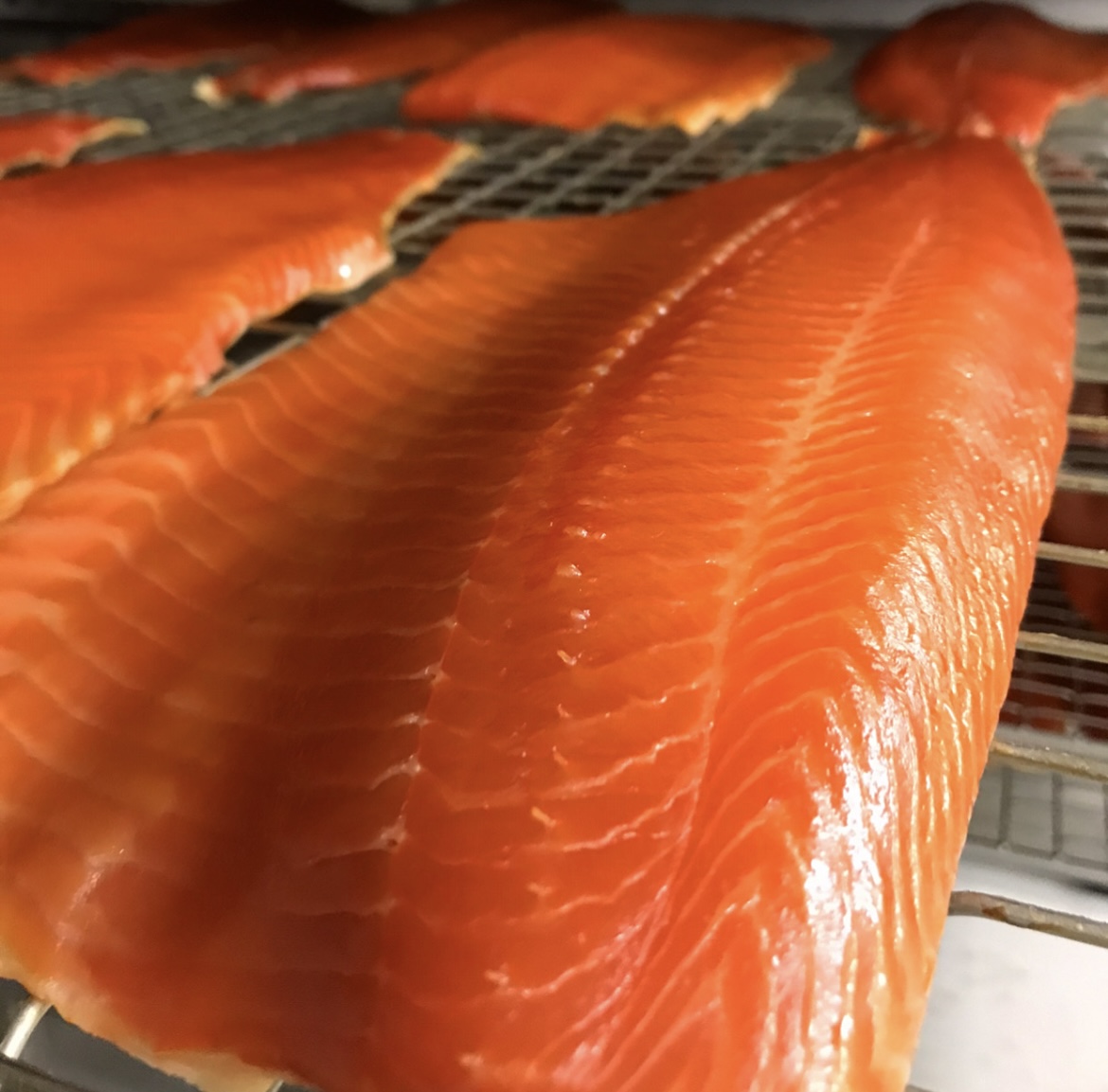 First the cold-smoked trout is dry salted. The salt is then washed off and the fillet is dried before being smoked together with juniper berries and beech chips. After the fish has dried, it’s vacuum-packed before being weighed for the customer.